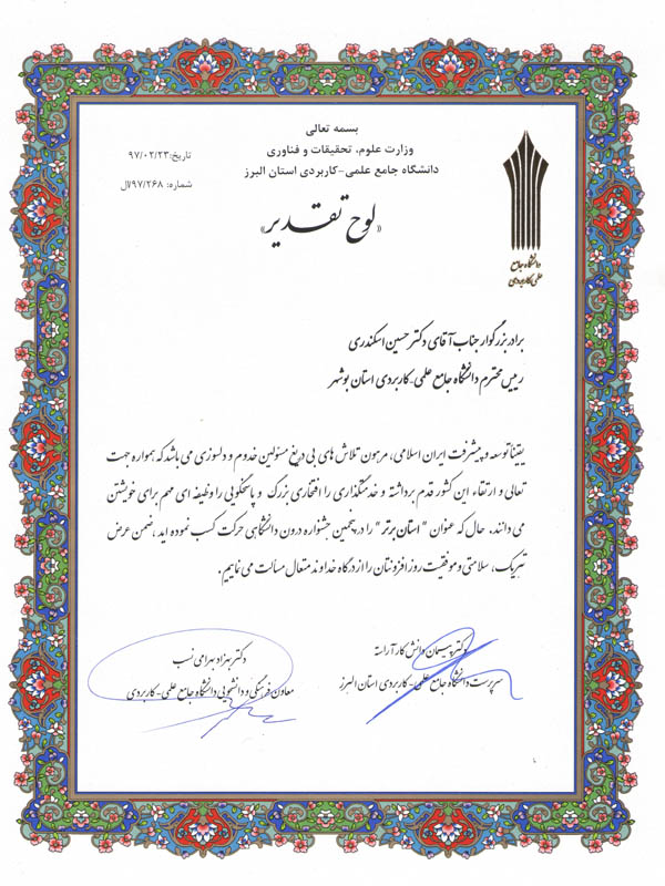 کسب مقام استان برتر در پنجمین جشنواره درون دانشگاهی حرکت کسب مقام استان برتر در پنجمین جشنواره درون دانشگاهی حرکت ۲۹ اردیبهشت ۱۳۹۷ | ۱۴:۱۵ کد : ۳۸۷۸۵ اخبار ارسال به دیگران نام شما ایمیل شما ایمیل دریافتکننده ارسال انصراف تعداد بازدید:۲۰۸۵ کسب مقام استان برتر در پنجمین جشنواره درون دانشگاهی حرکت