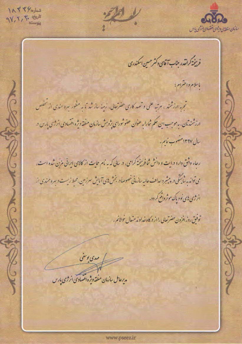 انتصاب رئیس دانشگاه جامع علمی کاربردی استان بوشهر به عنوان عضو شورای پژوهش منطقه ویژه اقتصادی انرژی پارس در سال ۱۳۹۷