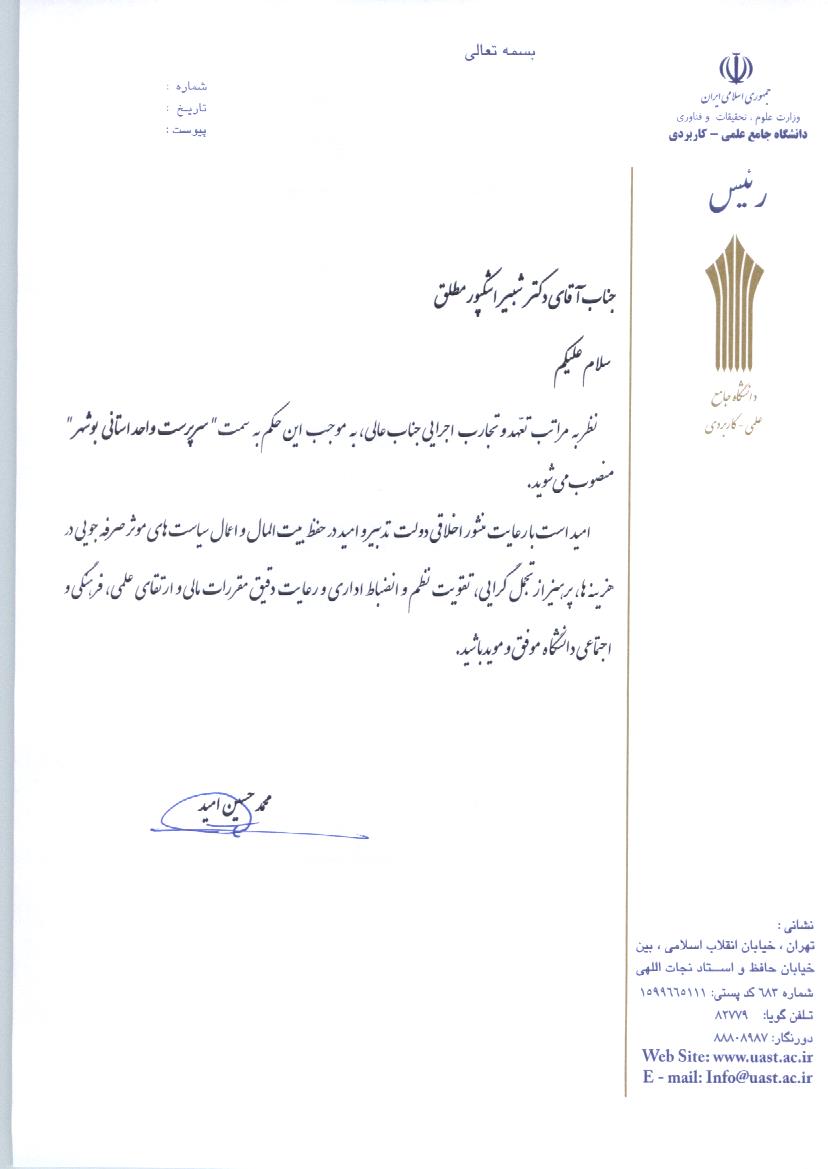 انتصاب سرپرست جدید دانشگاه جامع علمی کاربردی استان بوشهر