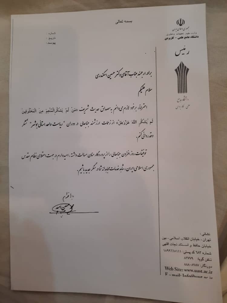 به گزارش روابط عمومی دانشگاه علمی کاربردی بوشهر، دکتر امید رییس دانشگاه علمی کاربردی کشور با توجه به خاتمه دو دوره ۲ ساله ریاست دکتر حسین اسکندری بر واحد استانی بوشهر با تقدیر و تشکر از زحمات ارزشمند ایشان طی حکمی دکتر شبیر اشکپور مطلق را به عنوان سرپرست دانشگاه علمی کاربردی استان بوشهر منصوب کرد.
