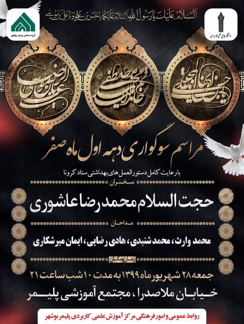 اجرای مراسم سوگواری دهه اول ماه صفر با رعایت کامل دستور العمل های بهداشتی ستاد کرونای استان بوشهر به همت مرکز آموزش علمی کاربردی گروه صنعتی پلیمر بوشهر
