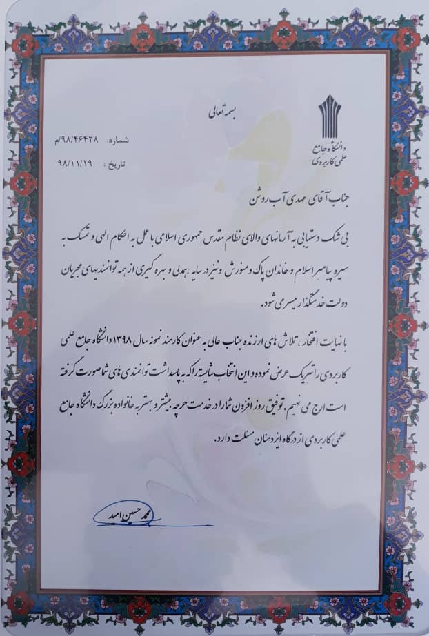با نهایت افتخار، تلاش های ارزنده جنابعالی به عنوان کارمند نمونه سال 1398 دانشگاه جامع علمی کاربردی را تبریک عرض نموده و این انتخاب شایسته را به پاسداشت توانمندی های شما صورت گرفته است ارج می نهیم. توفیق روز افزون شما را در خدمت هر چه بیشتر و بهتر به خانواده بزرگ دانشگاه جامع علمی کاربردی از درگاه ایزدمنان مسئلت دارد.