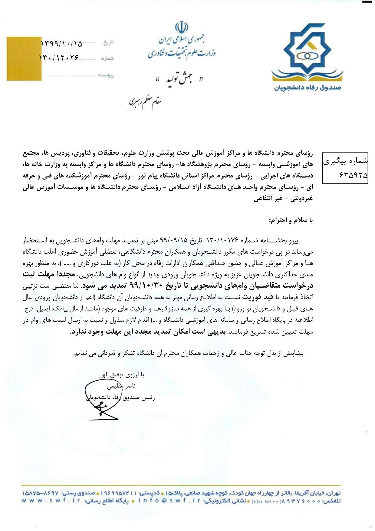 بخشنامه در خصوص تمدید وام تا ۹۹/۱۰/۳۰ نیمسال اول سال تحصیلی۱۴۰۰-۱۳۹۹ ۲۱ دی ۱۳۹۹ | ۰۹:۴۸ کد : ۵۳۲۷۵ اخبار ارسال به دیگران نام شما ایمیل شما ایمیل دریافتکننده ارسال انصراف تعداد بازدید:۵۴۱ بخشنامه در خصوص تمدید وام تا ۹۹/۱۰/۳۰ نیمسال اول سال تحصیلی۱۴۰۰-۱۳۹۹