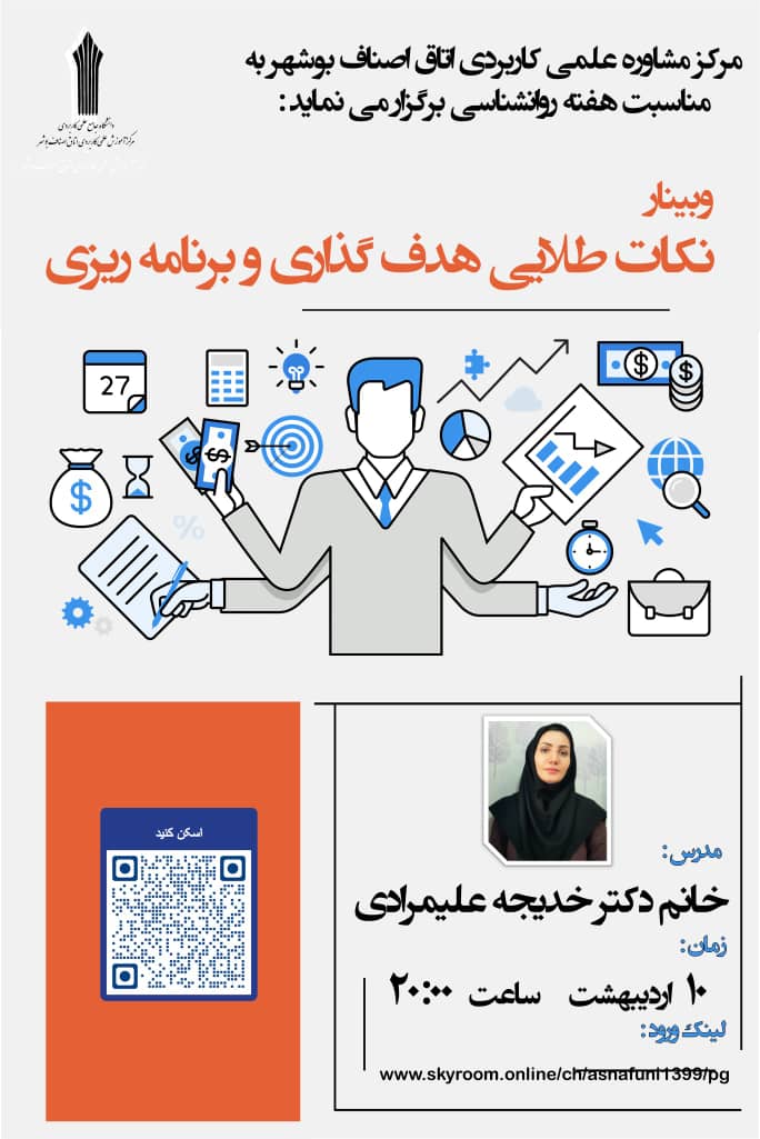 ۱- وبینار نکات طلایی هدف گذای و برنامه ریزی؛مدرس:دکتر خدیجه علیمرادی،زمان: ۱۰ اردیبهشت ساعت ۲۰