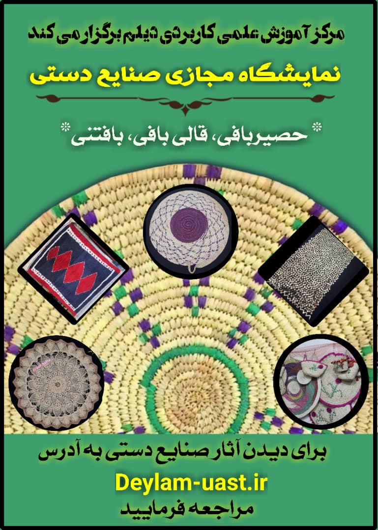 مرکز آموزش علمی کاربردی دیلم برگزار می کند: برگزاری نمایشگاه مجازی صنایع دستی ۰۵ تیر ۱۴۰۰ | ۰۹:۲۶ کد : ۵۵۳۶۸ اخبار ارسال به دیگران نام شما ایمیل شما ایمیل دریافتکننده ارسال انصراف تعداد بازدید:۳۶۹ جهت دیدن آثار به نشانی زیر مراجعه فرمایید: http://deylam-uast.ir/