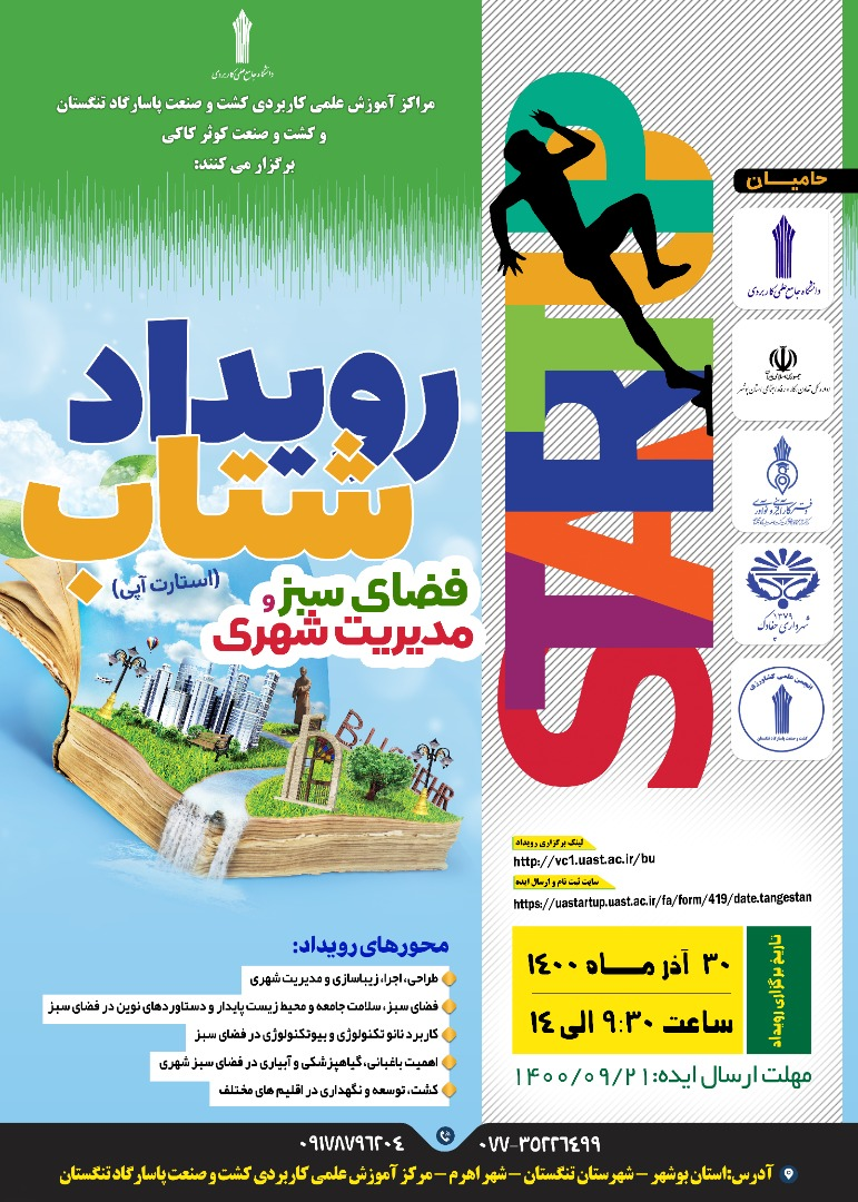 رویداد شتاب ( استارت آپی ) فضای سبز و مدیریت شهری توسط مراکز آموزش علمی کاربردی کشت و صنعت پاسارگاد تنگستان و کوثر کاکی برگزار می شود