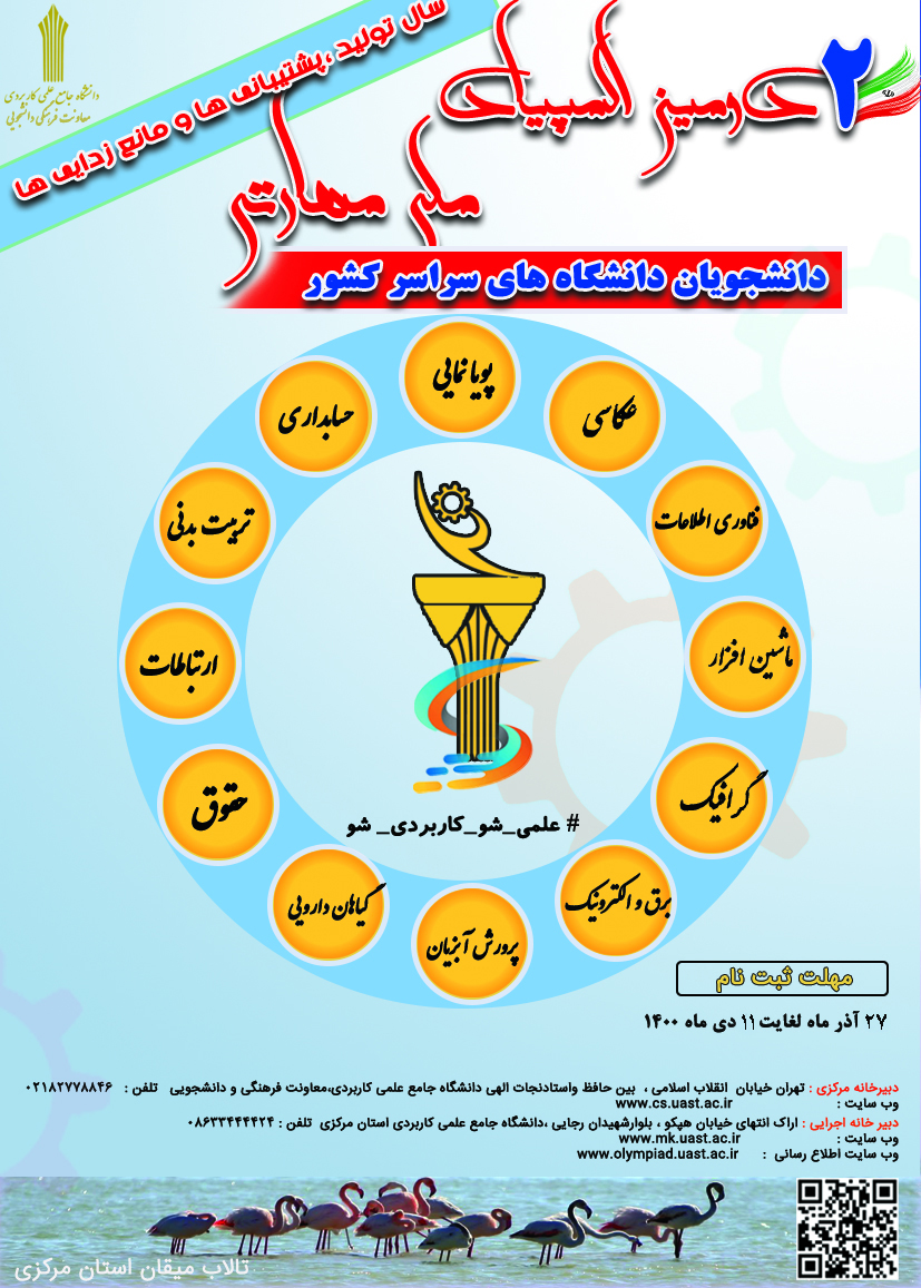 لازم به ذکر است دومین المپیاد ملی مهارتی دانشجویان سراسر کشور در ۴ گروه آموزشی فنی، مهندسی و صنعت، کشاورزی و منابع طبیعی، علوم انسانی، مدیریت و خدمات اجتماعی و فرهنگ و هنر در ۱۲ گروه رشته فناوری اطلاعات، ماشین افزار، برق و الکترونیک، گرافیک، پویانمایی، عکاسی، تربیت بدنی، حقوق، حسابداری، ارتباطات، گیاهان دارویی و پرورش آبزیان برگزار می شود و دانشجویان فقط می توانند در رشته مهارتی مرتبط با رشته تحصیلی خود مطابق با دستورالعمل اجرایی که بر روی سایت اطلاعرسانی المپیاد به آدرس http://olympiad.uast.ac.ir قرار گرفته است شرکت کنند.