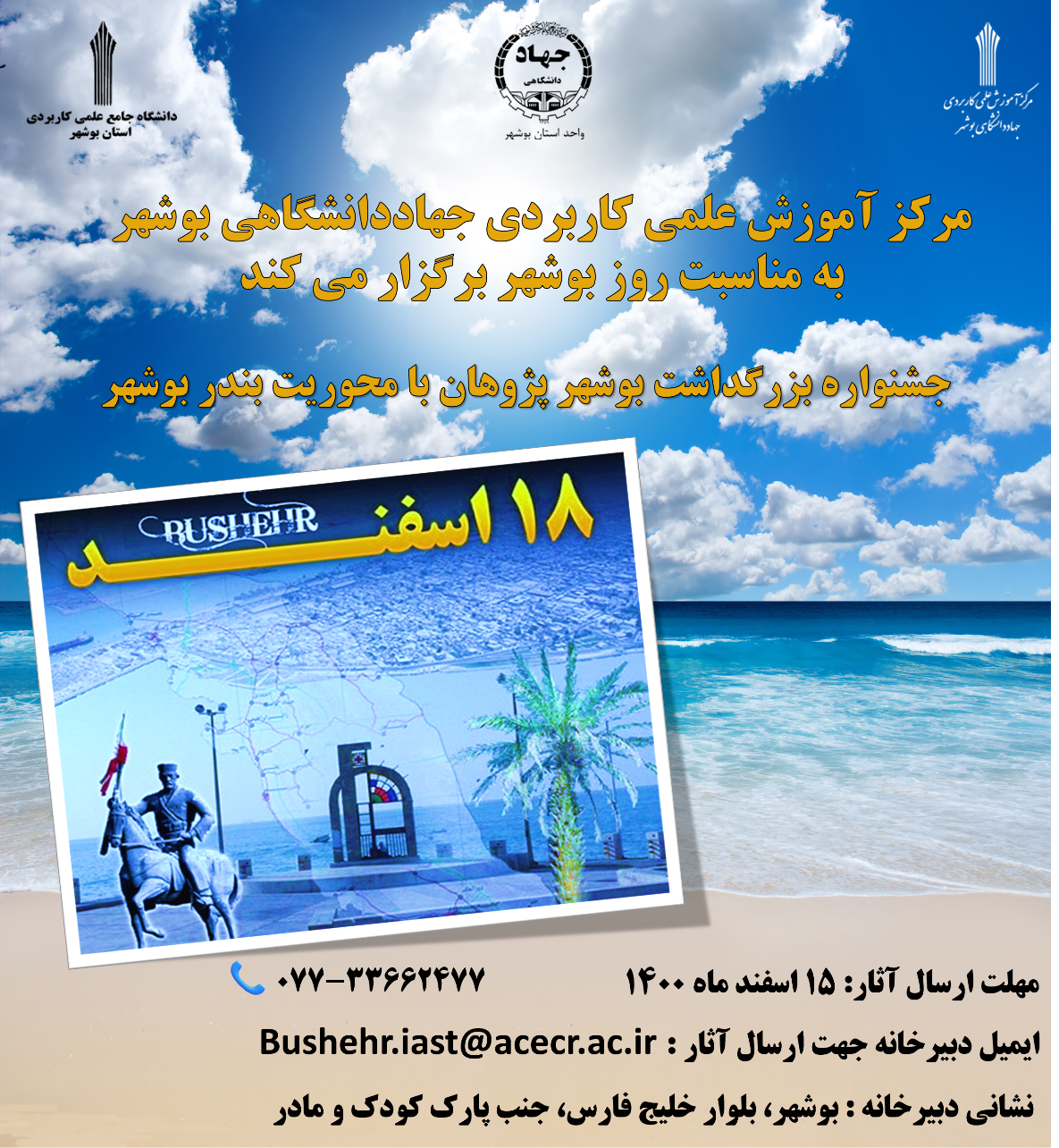 به گزارش روابط عمومی دانشگاه جامع علمی کاربردی استان بوشهر؛ جشنواره بزرگداشت بوشهر پژوهان با محوریت بندر بوشهر به مناسبت ۱۸ اسفند ماه روز ملی بوشهر با همت مرکز آموزش علمی کاربردی جهاددانشگاهی و حمایت واحد استانی بوشهر برگزار می شود. آخرین مهلت ارسال آثار جشنواره مورخ ۱۵ اسفندماه ۱۴۰۰ می باشد.