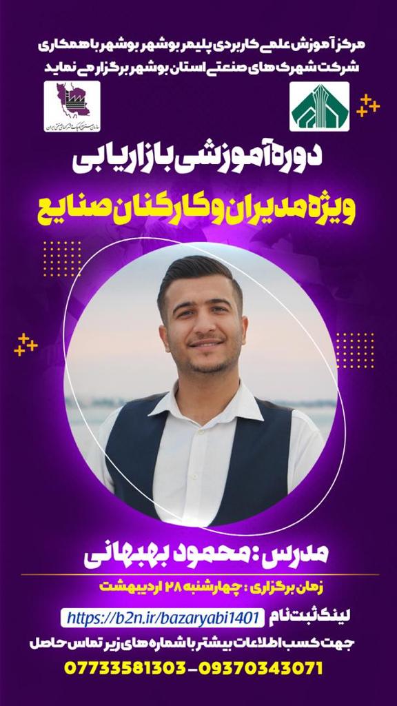 به گزارش روابط عمومی دانشگاه جامع علمی کاربردی استان بوشهر؛ دوره آموزشی بازاریابی ویژه مدیران و کارکنان صنایع به همت مرکز آموزش علمی کاربردی گروه صنعتی پلیمر بوشهر، با حمایت و همکاری شرکت شهرک های صنعتی استان و دانشگاه جامع علمی کاربردی استان بوشهر در روز چهارشنبه مورخ ۲۸ اردیبهشت ماه سالجاری برگزار می گردد. شایان ذکر است به تمامی شرکت کنندگان در این دوره آموزشی گواهینامه معتبر اعطاء می گردد.