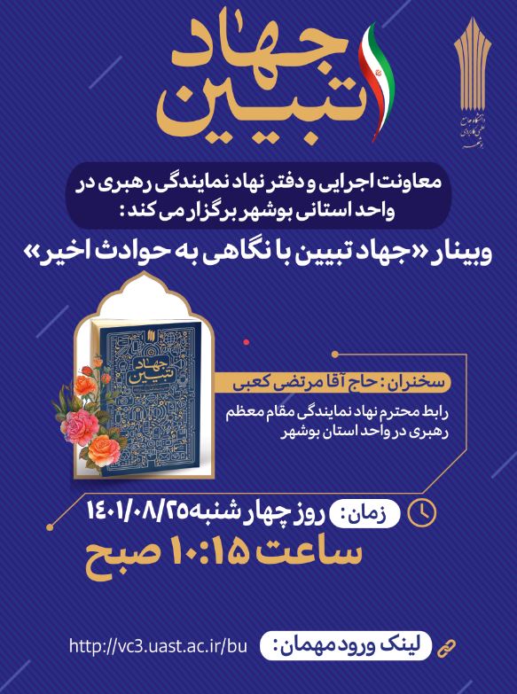 به گزارش روابط عمومی دانشگاه جامع علمی کاربردی استان بوشهر، معاونت اجرایی واحد استانی بوشهر با همکاری دفتر نهاد نمایندگی مقام معظم رهبری، وبینار "جهاد تبیین با نگاهی به حوادث اخیر" را برگزار کرد. این وبینار در روز چهار شنبه مورخ ۲۵ آبان ماه سال جاری با سخنرانی حجت الاسلام حاج آقا مرتضی کعبی رابط دفتر نهاد نمایندگی مقام معظم رهبری در دانشگاه جامع علمی کاربردی استان برگزار شد.